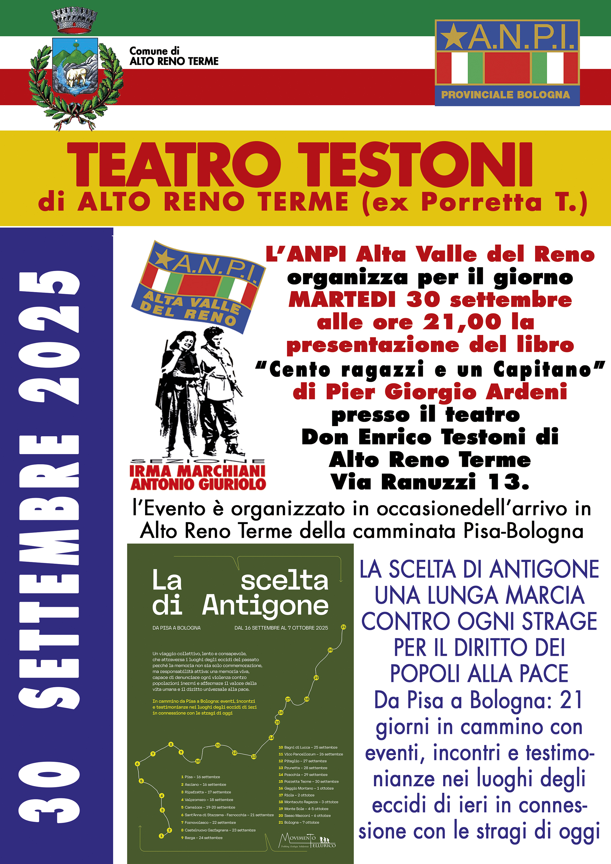 In occasione dell'arrivo a Porretta Terme della camminata Pisa-Bologna "La scelta di Antigone", presentazione del libro patrocinata dall'ANPI con la partecipazione dell'autore.
